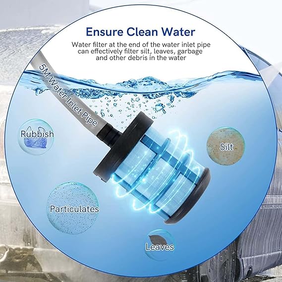 - DRAWS WATER FROM ANYWHERE – Come with a 5M long garden hose allow you to draw water from any fresh water source like a pool, lake, or bucket and . You can hook up to a garden hose at the house or even a 2L bottle on the go.